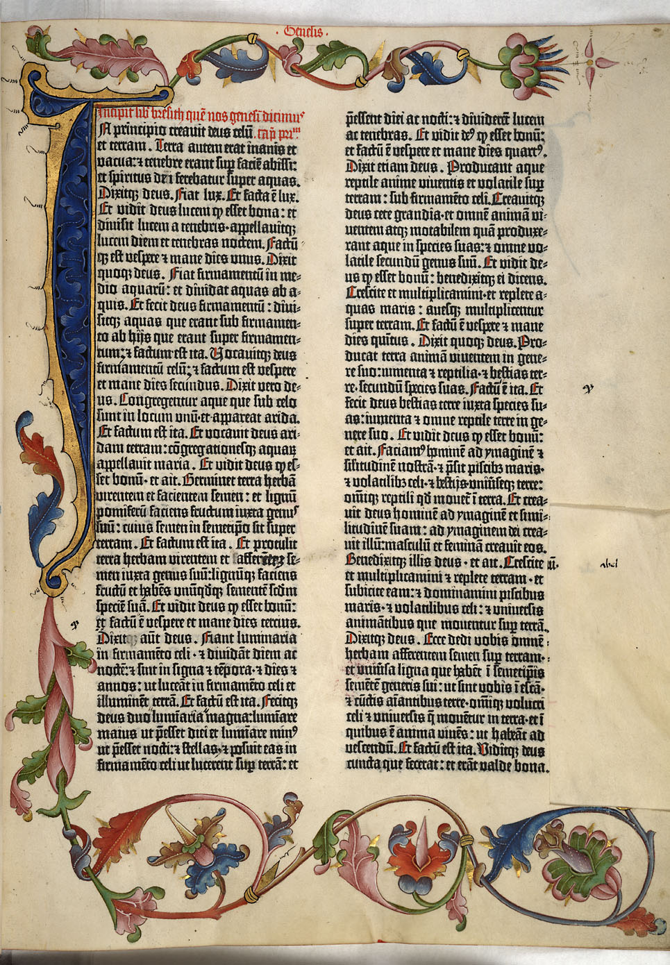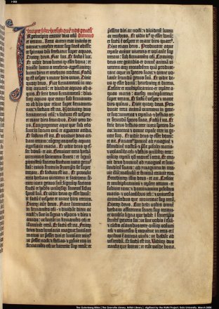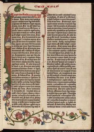 JPG file Genesis 1 from an original Gutenberg bible 1452 in Latin, from Germany.
